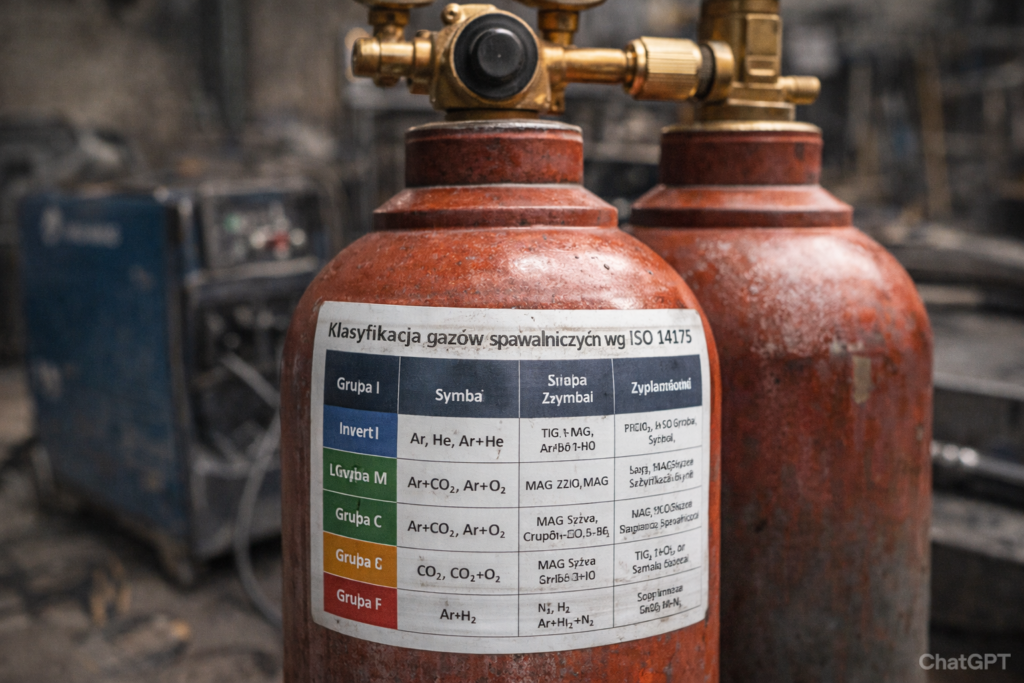 | I – Inert | Gazy obojętne | Ar, He, Ar+He | TIG, MIG (aluminium, tytan) | I1 (Ar), I2 (Ar+He), I3 (Ar+25%He) |