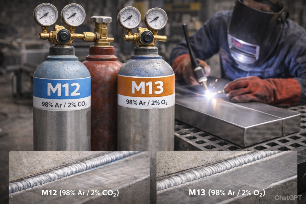 Mieszanka M13 zawiera 98% argonu i 2% tlenu zamiast dwutlenku węgla. Zastosowanie tlenu O₂ zamiast CO₂ daje nieco inne właściwości spawalnicze – lepszą stabilność łuku przy niskich prądach i płynniejsze jeziorko spawalnicze. Niektórzy spawacze preferują M13 dla stali nierdzewnej ze względu na estetykę spoiny i mniejszą skłonność do podcięć.