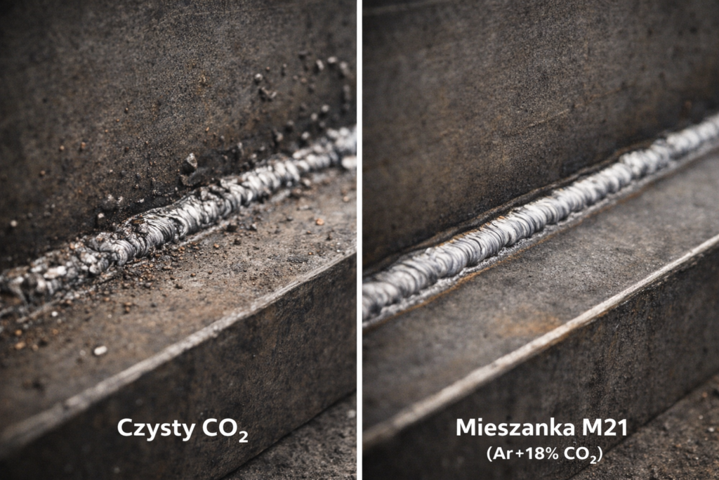 Różnica w jakości spoiny: czysty CO₂ (lewa) vs mieszanka M21 Ar+18%CO₂ (prawa)